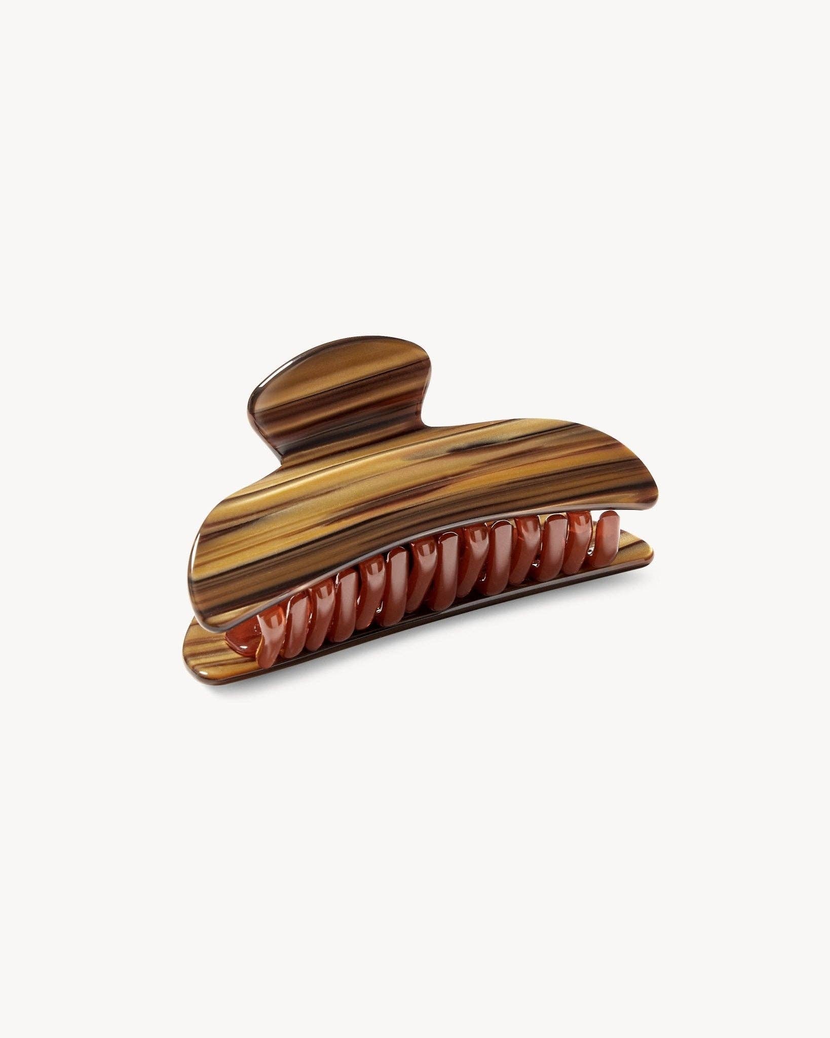 A double-walled hair claw designed to hold medium volumes of hair, handcrafted from Italian acetate with reinforced hardware. Recommended for all hair types and textures.